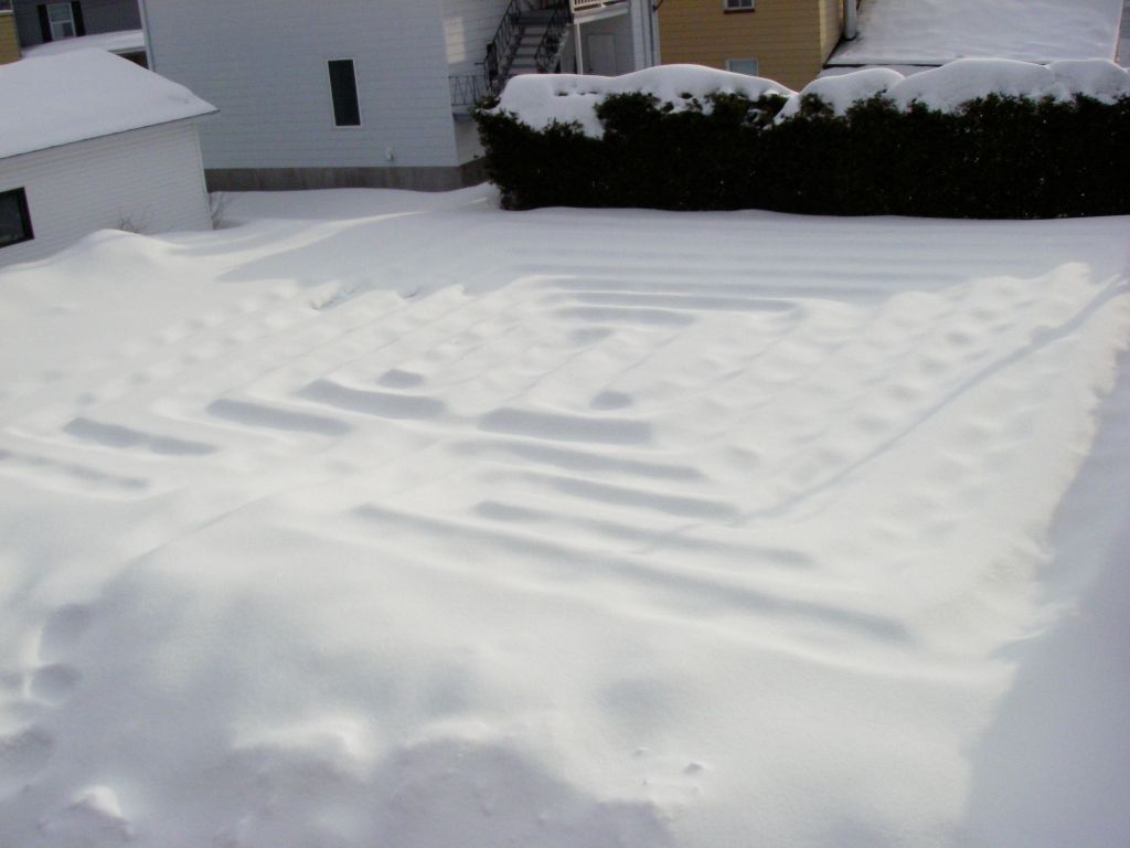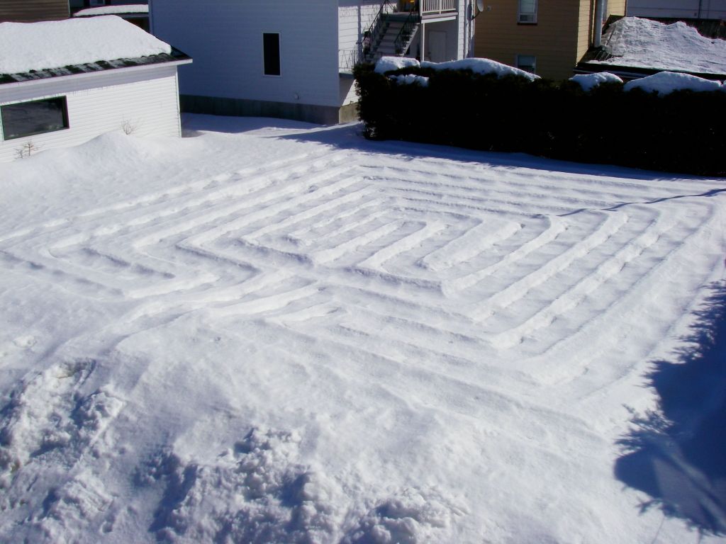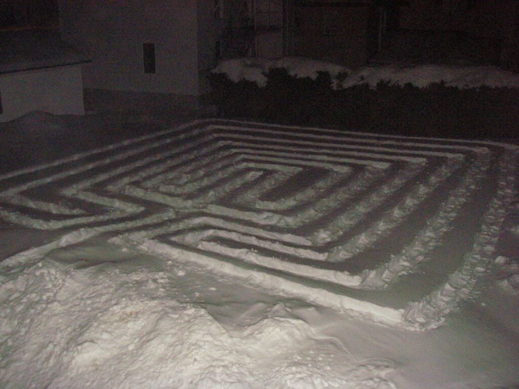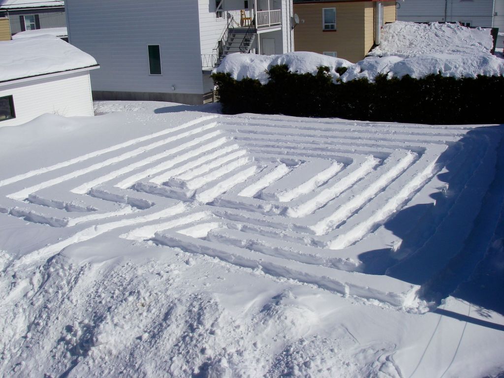 En 2009, après avoir longuement observé la neige sur une parcelle de mon jardin, je trace un labyrinthe en marchant avec mes raquettes. Le dessin reprend un symbole de la culture Hopi et il peut être observé de mon balcon. Par la photographie, je documente son altération dans le temps.
