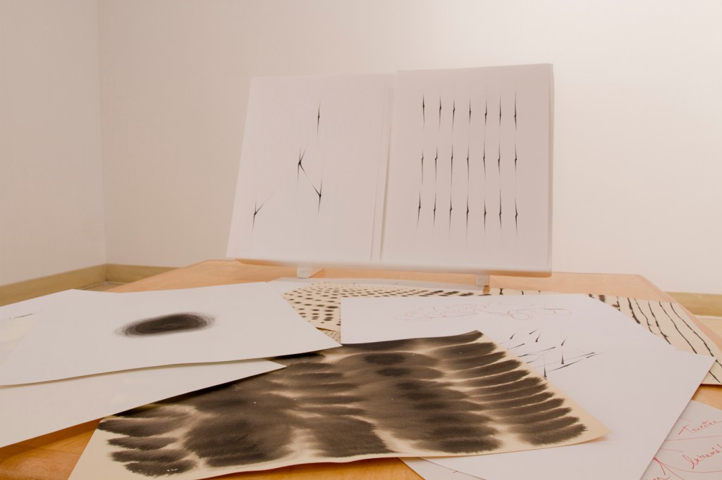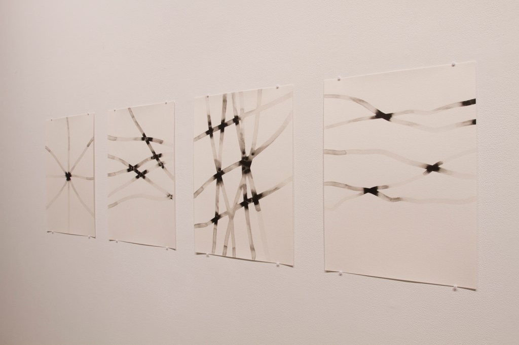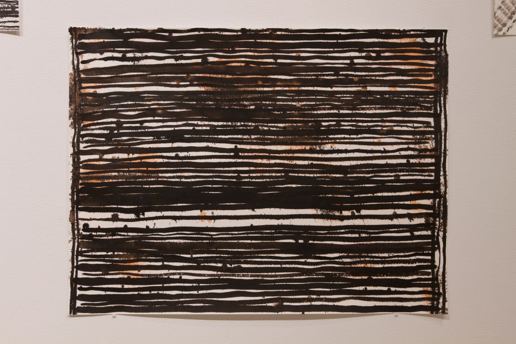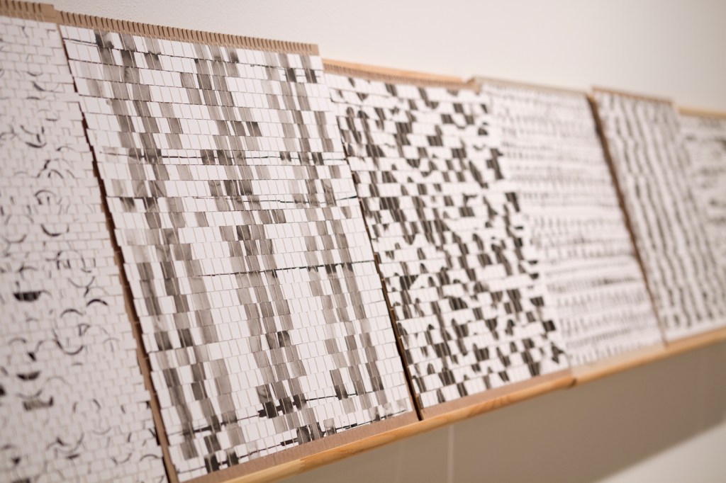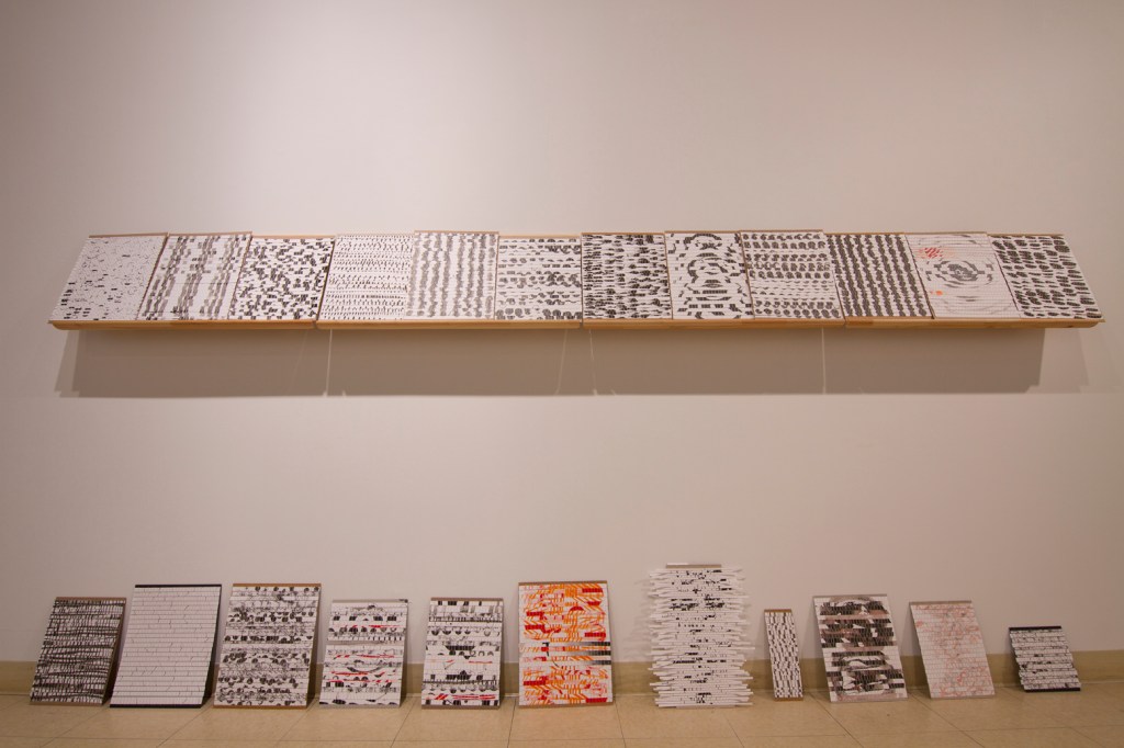 Exploration du lien entre le dessin et la tradition du tissage sur métier telle que l’exerce les femmes de communautés rurales. Recyclage de mes chutes d’atelier. Dimension relationnelle, collaborative et intime avec la participation de ma soeur, Marjorie Durand, qui venait me visiter à l’atelier pour tisser avec moi.