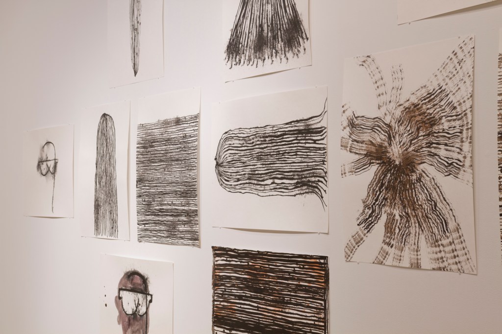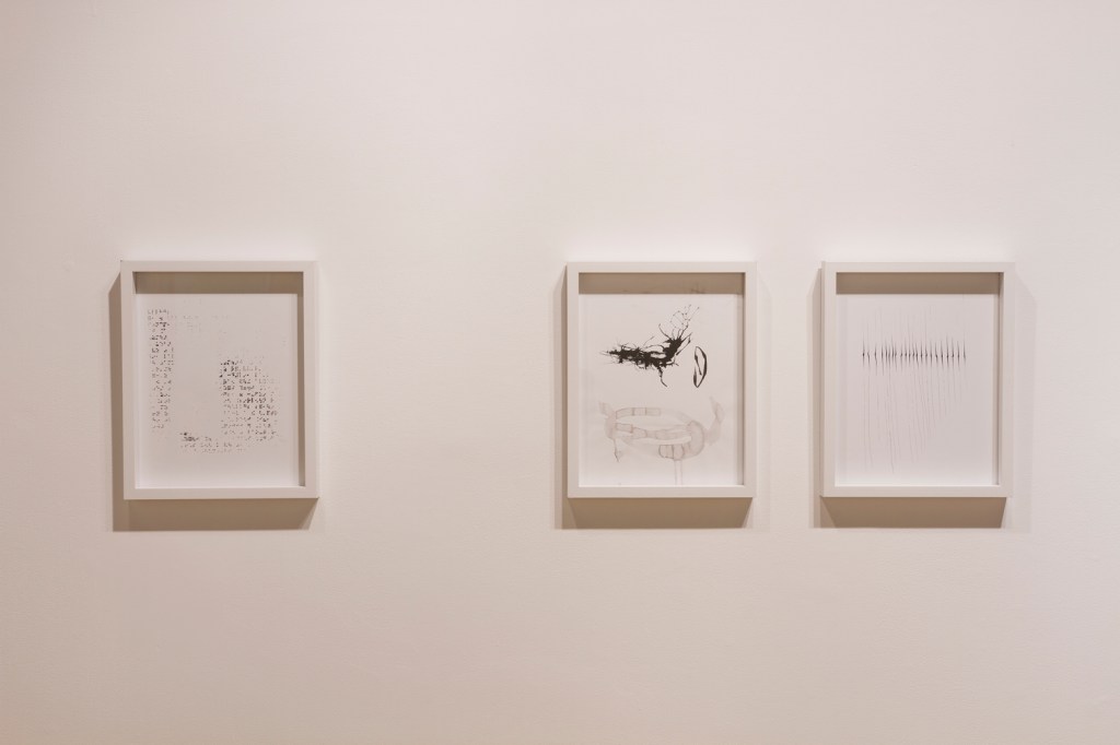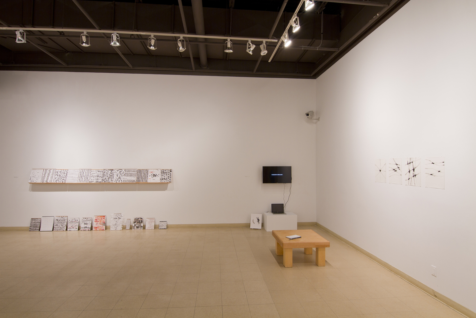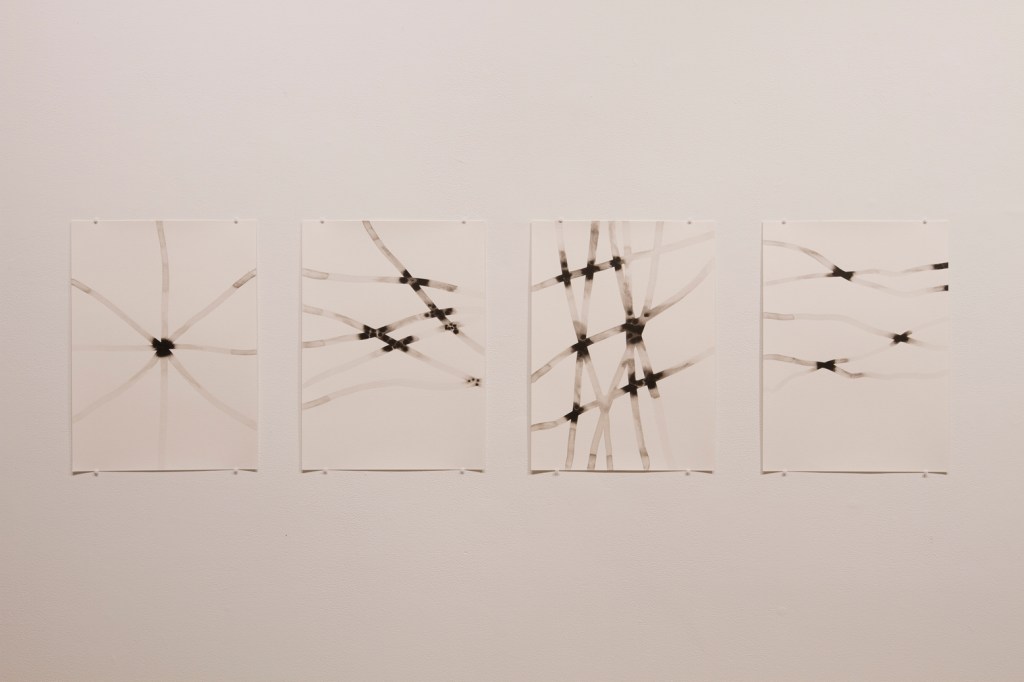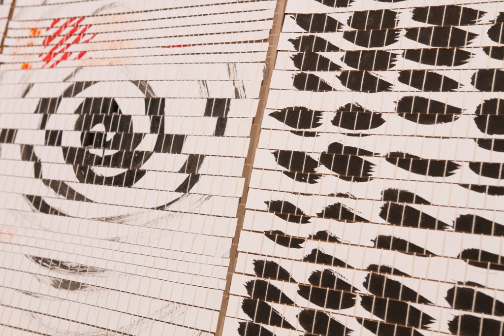 Exploration du lien entre le dessin et la tradition du tissage sur métier telle que l’exerce les femmes de communautés rurales. Recyclage de mes chutes d’atelier. Dimension relationnelle, collaborative et intime avec la participation de ma soeur, Marjorie Durand, qui venait me visiter à l’atelier pour tisser avec moi.